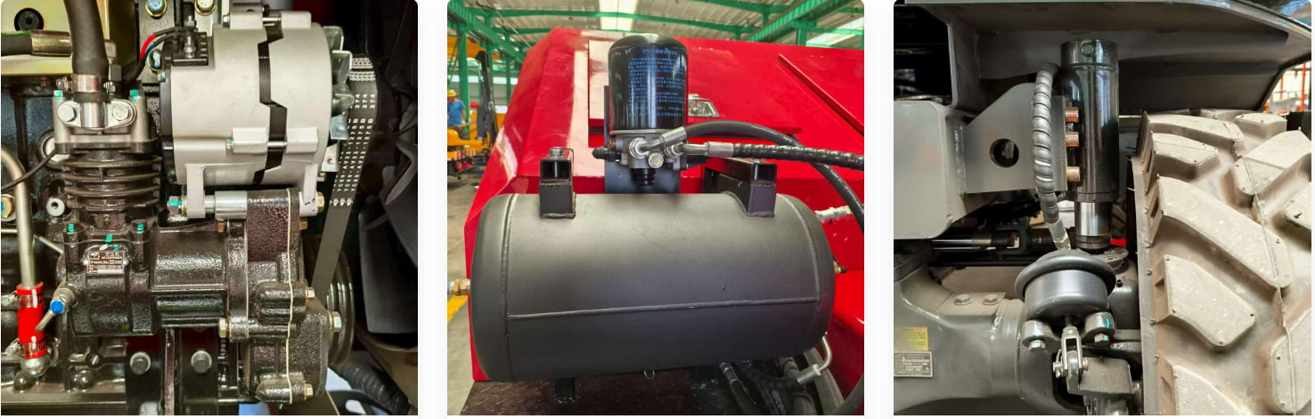 Se incluye un pequeño compresor de aire independiente para garantizar un suministro de aire estable y un funcionamiento fiable del sistema de frenos. Además, se incluye un tanque de almacenamiento de aire que almacena aire comprimido, estabiliza la presión durante el funcionamiento del equipo, reduce las fluctuaciones de presión causadas por los frecuentes arranques y paradas del compresor y proporciona una fuente de aire estable para el sistema neumático.